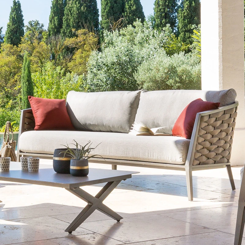 Complétez votre salon de jardin avec le canapé extérieur 3 places Embruns noisette / praline de marque Hespéride.
