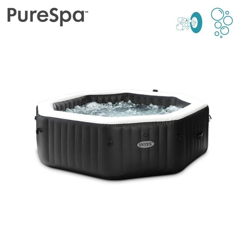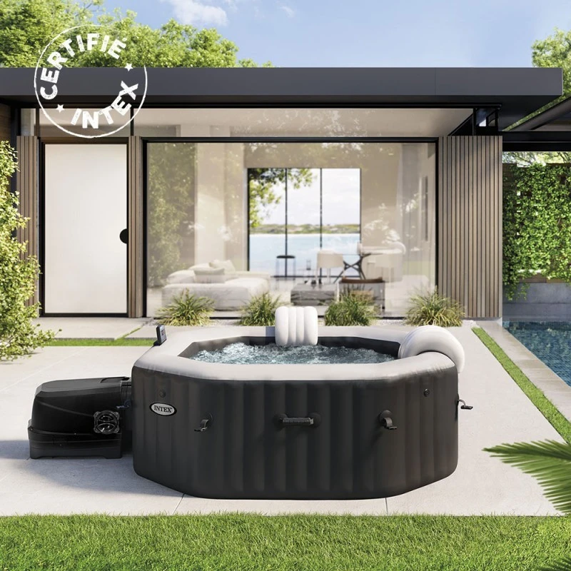 Spa octogonal 4 places Intex qui vous offrira un agréable moment de détente cette été dans l’eau bouillonnante.