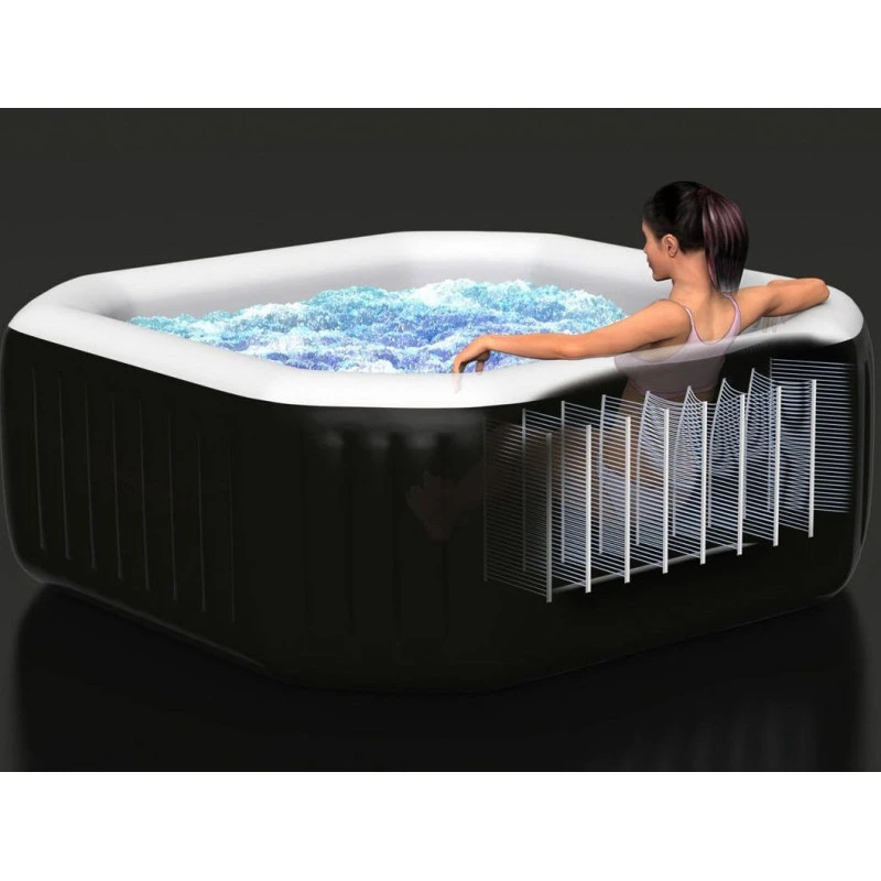Se gonfle facilement. Il dispose de 120 jets à bulles et de 4 jets massant orientables et réglables en intensité.